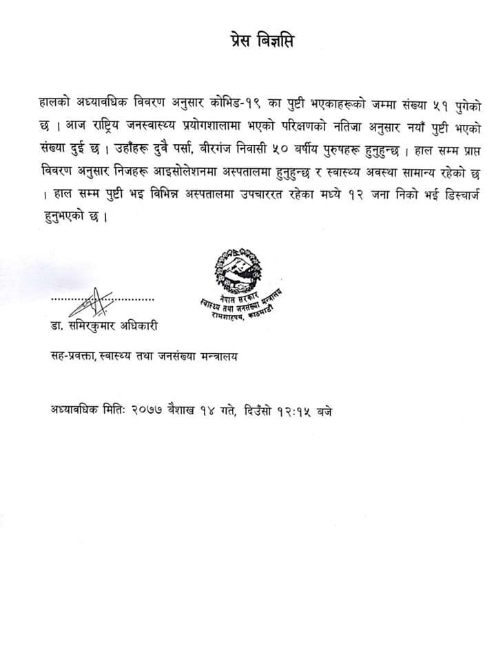 स्वास्थ्य तथा जनसंख्या मन्त्रालयका सहप्रवक्ता डा. समीरकुमार अधिकारीका अनुसार राष्ट्रिय जनस्वास्थ्य प्रयोगशालामा गरिएको परीक्षणमा आज थप दुई जनामा कोरोना सङ्क्रमण पुष्टि भएको हो । कोरोना सङ्क्रमण पुष्टि हुनेमा पर्सा जिल्लाको वीरगञ्जका दुईजना पुरुष रहेका छन् । उनीहरु दुवैको उमेर ५० वर्ष रहेको छ । उनीहरुको वीरगञ्जमै अस्पतालको आइसोलेसनमा राखेर उपचार भइरहेको छ ।