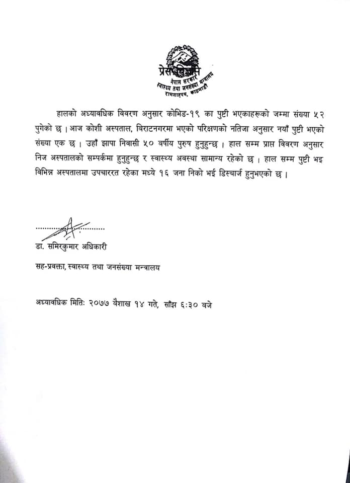 आज साँझ कोरोना पुष्टि भएकाका झापाका ५० वर्षका पुरुष रहेका स्वास्थ्य तथा जनसंख्या मन्त्रालयका सह प्रवक्ता डा. समिरकुमार अधिकारीले जानकारी दिनुभएको छ । ती व्यक्तिको कोशी अस्पताल विराटनगरमा गरिएको स्वाब परीक्षणमा कोरोना पुष्टि भएको हो ।