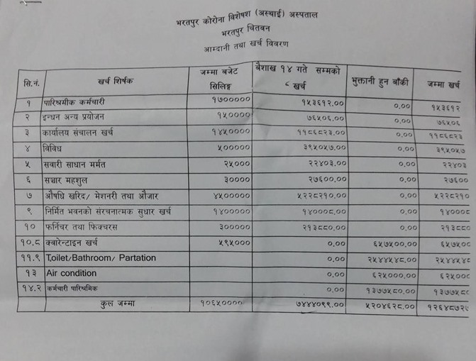 कोरोना अस्पताल सञ्चालन कार्यदलको बैठकमा भने महानगरका प्रमुख प्रशासकीय अधिकृत प्रेमराज जोशीले एक करोड २७ लाख खर्च भएको विवरण दिएको भए पनि अस्पतालमा वैशाख १४ गतेसम्म ७४ लाख ४४ हजार ९९ रुपैयाँ खर्च भएको विवरण सार्वजानिक भएको देखिन्छ ।