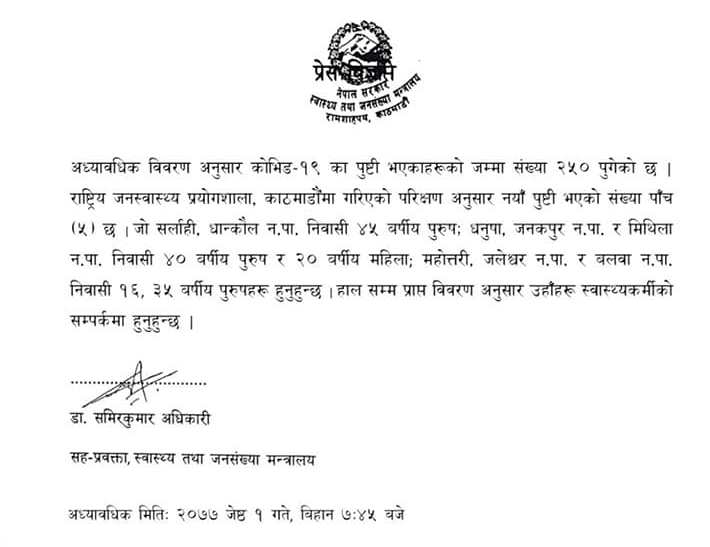 मन्त्रालयका सहप्रवक्ता डा समिरकुमार अधिकारीले राष्ट्रिय जनस्वास्थ्य प्रयोगशाला टेकुमा परीक्षण क्रममा बिहीबार नयाँ सात जनामा सङ्क्रमण देखिएको बताउनुभयो । यो सँगै कोरोना सङ्क्रमितको सङ्ख्या २५० पुगेको स्वास्थ्य तथा जनसंख्या मन्त्रालयले जनाएको छ ।
