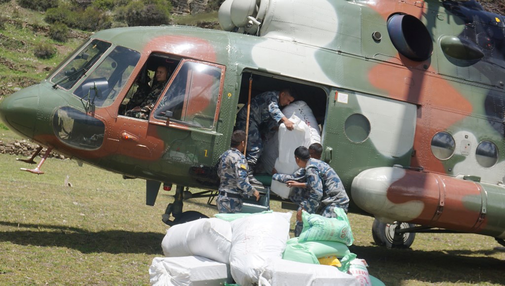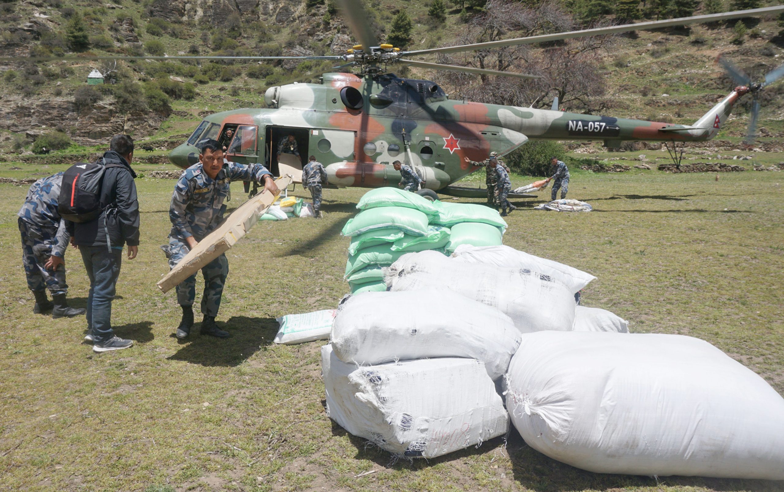 छाङरुमा सशस्त्र प्रहरी बल नेपालको सीमा सुरक्षा निगरानी चौकी (विओपी) का लागि आवश्यक सशस्त्र प्रहरीसहित खाद्यान्न र बन्दोबस्तीका सामान झार्दै नेपाली सेनाको हेलिकप्टर ।