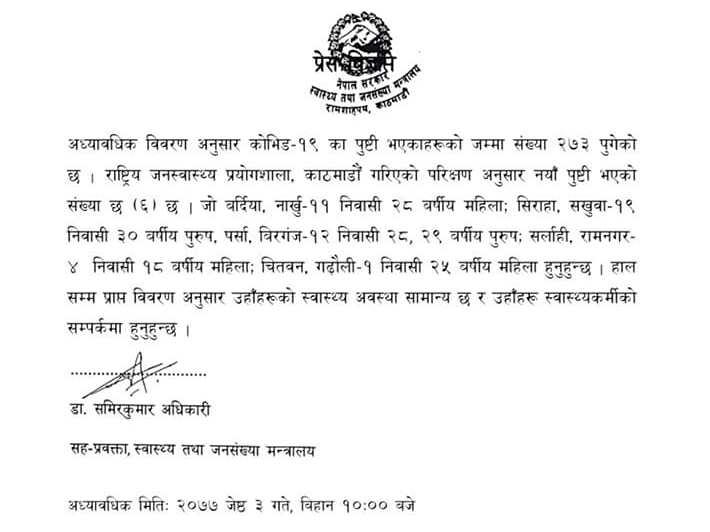 काठमाडौँ । नेपालमा कोरोनाभाइरस (कोभिड–१९) सङ्क्रमितको सङ्ख्या दुई सय ७३ पुगेको छ । स्वास्थ्य तथा जनसङ्ख्या मन्त्रालयले आज विहान १० बजे प्रेस विज्ञप्ति जारी गरी राष्ट्रिय जनस्वास्थ्य प्रयोगशाला, काठमाडौँमा गरिएको परीक्षणमा थप छ जनामा कोरोनाभाइरस सङ्क्रमण पुष्टि भएको र कूल सङ्क्रमित सङ्ख्या दुई सय ७३ पुगेको जनाएको छ ।