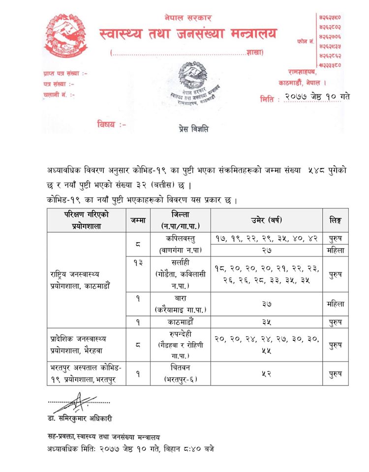 कपिलवस्तु, सर्लाही, बारा, रुपन्देही, काठमाडौँ र चितवनका गरी ३२ जना कोरोना सङ्क्रमित थपिएका र योसँगै नेपालमा सङ्क्रमितको सङ्ख्या पाँच सय ४८ पुगेको मन्त्रालयका सहप्रवक्ता डा. समीरकुमार अधिकारीले जानकारी दिनुभएको छ ।