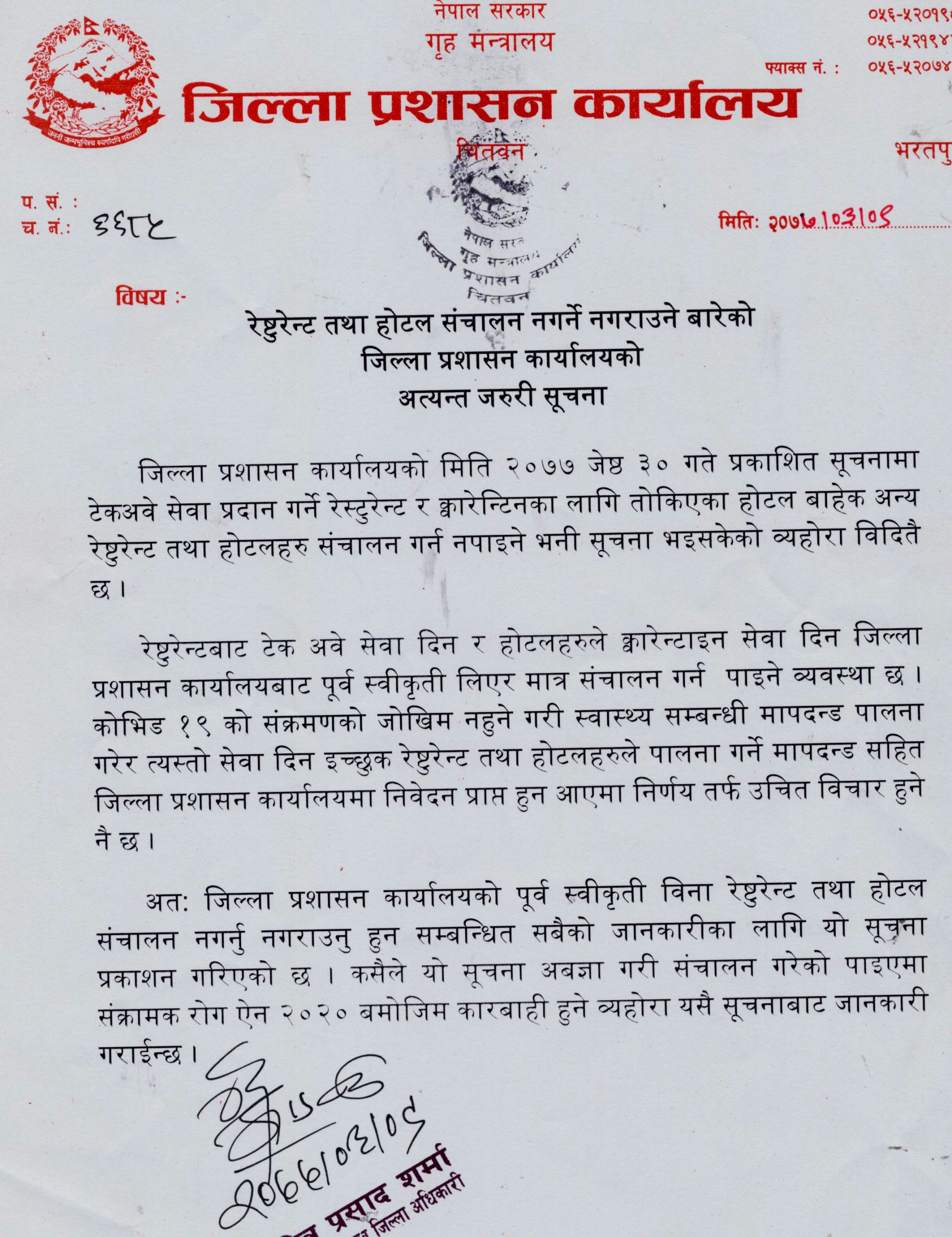 होटल तथा रेष्टुरेण्ट नखोल्न चितवन प्रशासनको आग्रह, अटेर गरे कारवाहीको चेतावनी
