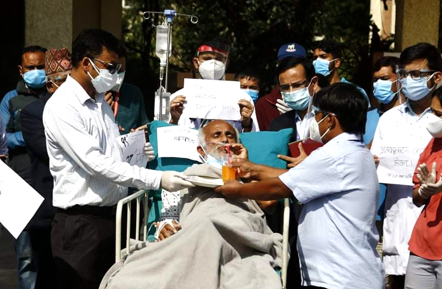 डा केसीले त्रिवि शिक्षण अस्पतालका सफाइ कर्मचारी विकास नेपालीको हातबाट जुस पिएर अनसन तोड्नु भएको हो । ४६ वर्षीय नेपालीलाई कोरोना संक्रमण भएर निको भएको थियो ।