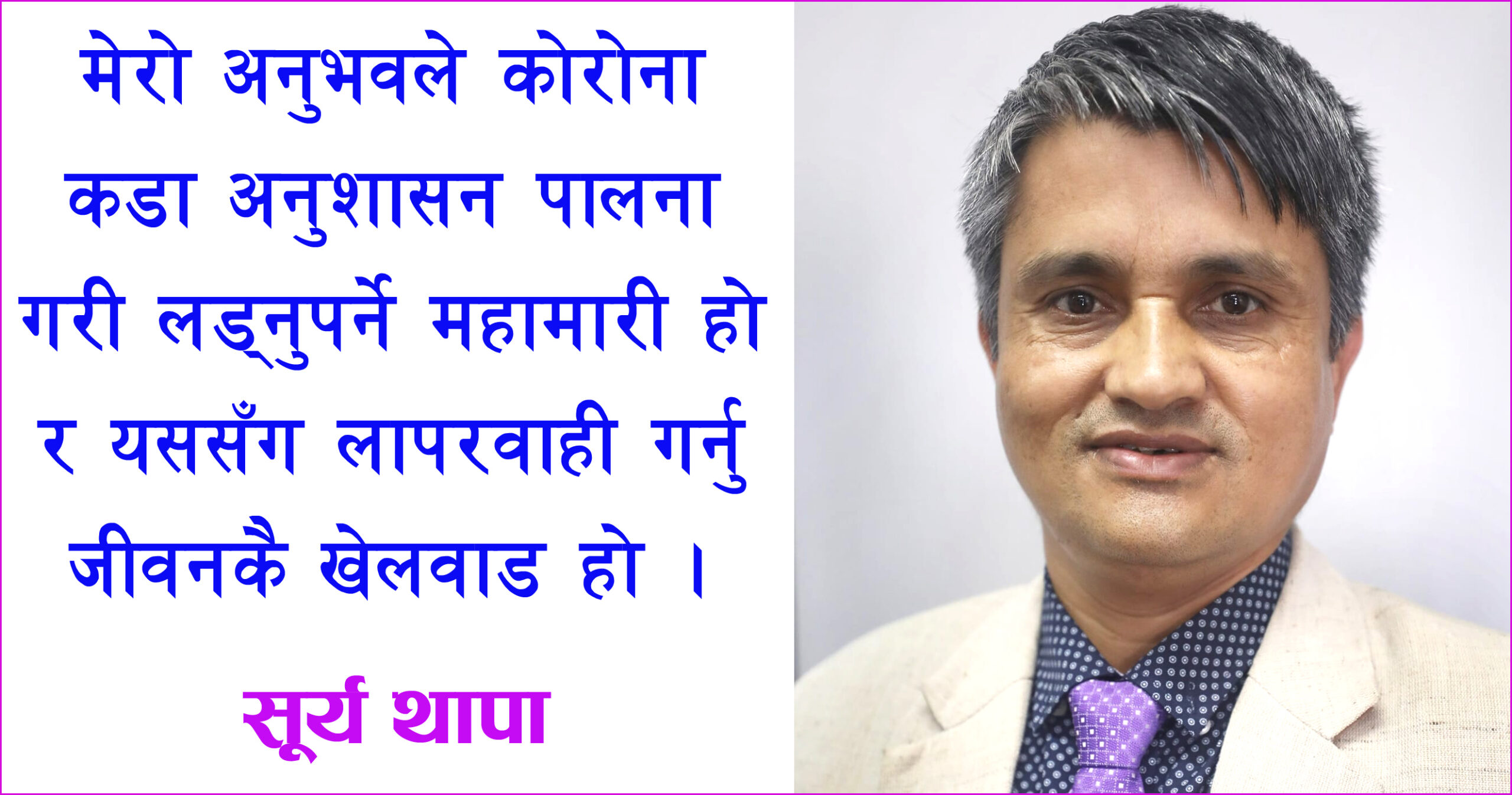 कोरोना संक्रमण विरूद्दको लडाईमा मेरो अनुभव सबैलाई जस्ताको तस्तै काम लाग्दैन । म लक्षणरहितको संक्रमित थिएँ । लक्षणसहितका संक्रमितले मैले जस्तो गर्न खोज्दा लापरबाही सावित भएर ज्यान नै जान पनि सक्छ । नेपालमा अहिले कोरोना विशेषज्ञहरू घरघरमै तयार भएका छन्। यसको परीक्षणको पूर्वाधार देशैभरि बनाउने काम भएको छ। स्वास्थ्यकर्मीहरू जीवन जोखिममा राखेर पनि महामारीविरूद्द फ्रन्टलाइनमा रहेर लडिरहेका छन् । हामीले हेलचक्र्याई नगरी सरकारको योजना र विशेषज्ञहरूको निर्देशनको पालना गरी स्वस्थ र सभ्य बन्ने, आफू जोगिने र अरूलाई पनि जोगाउने पवित्र भावनाका साथ क्रियाशील हुनु आवश्यक छ ।