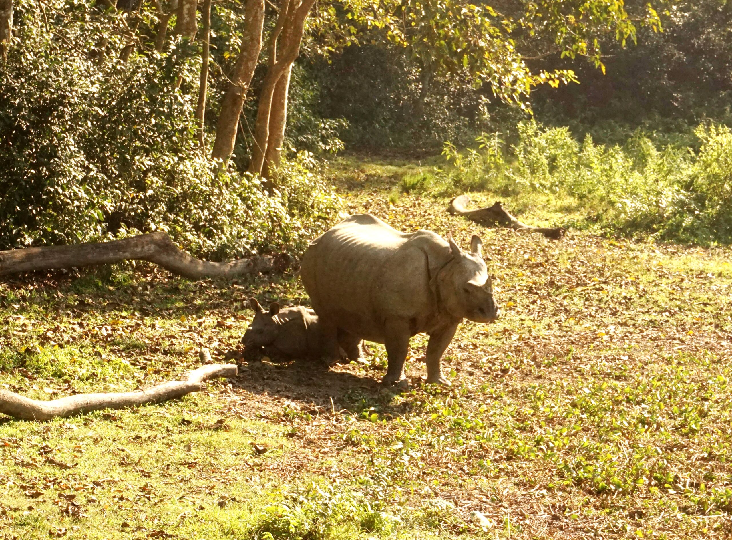 केही दिनअघि यहाँको सानो चौरमा काखमा केटो चेपेर माउ गैँडा लमतन्न परेर घाम तापिरहेकी थिई । हात्तीको खस्राकखुस्रुक आवाजले कान ठाडो पारेर हेरी । माहुतेको इसारामा हात्ती एक टकले उभियो । हात्तीमा सयर पर्यटकले मौन बसेर विभिन्न कोणका तस्बीर लिए, अनि गैँडासँग नजीकपनको अनुभूति सङ्गाले । आफू र केटोको सुरक्षा जोखिम नरहेको बुझेपछि माउ–बच्चा फेरि उही आसनमा लमतन्न परेर घाम ताप्नमा मग्न भए ।