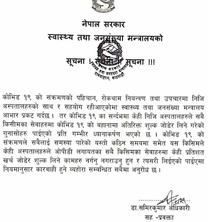 बिरामीसँग अतिरिक्त शुल्क लिएको पाइएमा त्यस्ता अस्पताललाई कानुनअनुसार कारबाही गरिनेसमेत उहाँले बताउनु भएको छ । “कोभिड–१९ को सन्दर्भमा केही निजी अस्पतालले सबै किसिमका सेवामा कोभिड–१९ को बहानामा अतिरिक्त शुल्क जोडेर लिने गरेको गुनासो पाइएकोप्रति मन्त्रालयको गम्भीर ध्यानाकर्षण भएको छ” सूचना जारी गर्दै उहाँले भन्नुभएको छ “कोभिड–१९ को संक्रमणको समस्याले सबैलाई परेको यस्तो कठिन समयमा समेत केही निजी अस्पतालले बहिरङ्ग सेवालगायतका सबै किसिमका सेवामा केही प्रतिशत खर्च जोडेर शुल्क लिने काम नगर्न/नगराउन अनुरोध छ ।