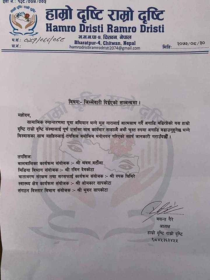 हाम्रो दृष्टि राम्रो दृष्टि संस्थाको क्षेत्र बिभाग समिति विस्तार