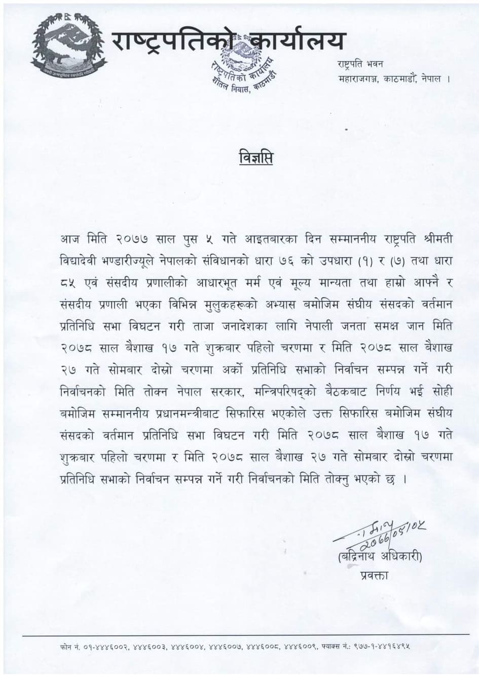 संविधानको धारा ७६ को उपधारा (१) र (७) तथा धारा ८५ एवं संसदीय प्रणालीको आधारभूत मर्म एवं मूल्य मान्यता तथा हाम्रो आफ्नै र संसदीय प्रणाली भएका विभिन्न मुलुकहरूको अभ्यास बमोजिम संघीय संसदको वर्तमान प्रतिनिधि सभा विघटन गरी ताजा जनादेशका लागि नेपाली जनता समक्ष जान मिति २०७८ साल वैशाख १७ गते शुक्रबार पहिलो चरणमा र मिति २०७८ साल बैशाख २७ गते सोमबार दोस्रो चरणमा अर्को प्रतिनिधि सभाको निर्वाचन सम्पन्न गर्ने गरी निर्वाचनको मिति तोक्न नेपाल सरकार, मन्त्रिपरिषद्को बैठकबाट निर्णय भई सोही बमोजिम सम्माननीय प्रधानमन्त्रीबाट सिफारिस भएकोले उक्त सिफारिस बमोजिम संघीय संसदको वर्तमान प्रतिनिधि सभा विघटन गरी मिति २०७८ साल वैशाख १७ गते शुक्रबार पहिलो चरणमा र मिति २०७८ साल वैशाख २७ गते सोमबार दोस्रो चरणमा प्रतिनिधि सभाको निर्वाचन सम्पन्न गर्ने गरी निर्वाचनको मिति तोक्नु भएको छ,’ राष्ट्रपति कार्यालयको विज्ञप्तिमा भनिएको छ।