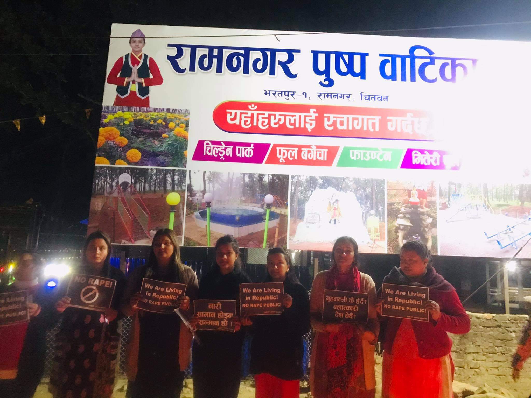 चितवन, ३० माघ । बलात्कारपछि हत्या गरिएकी बैतडीको दोगडाकेदार गाउँपालिका ७ चडेपानीकी १७ वर्षीया भागरथी भट्टको न्यायको माग गर्दै रामनगर पुष्पवाटिकामा प्रदर्शन गरिएको छ । भरतपुरको रामनगरमा रामनगर पुष्पवाटिका एवंम युवाहरुको समूहले भागिराथीको न्यायको माग गर्दै दिप प्रज्जवलन तथा प्रर्दशन गरेका हुन्।
