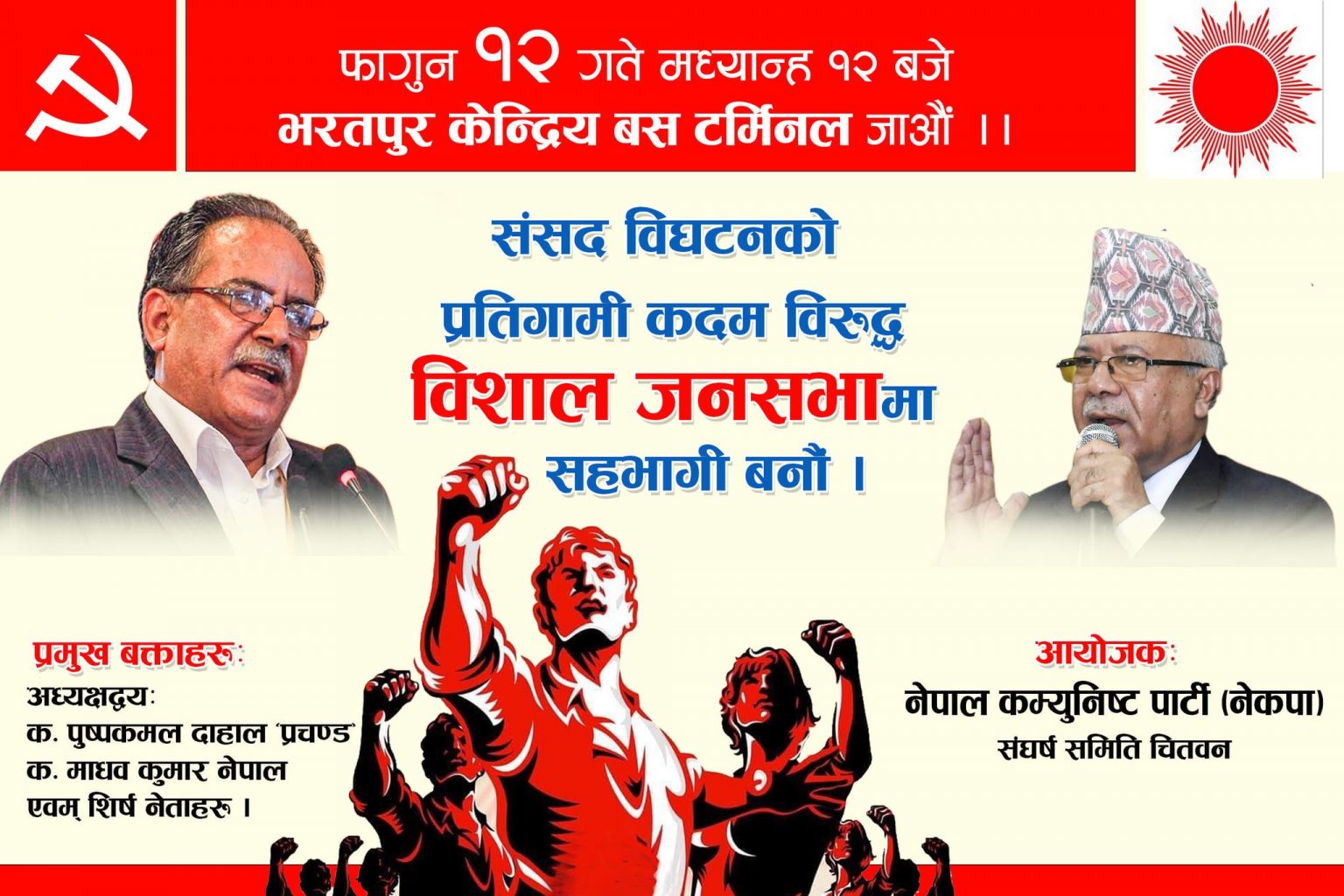 फागुन १२ गते दिउसो १२ बजे भरतपुर केन्द्रीय बस टर्मिनल परिसरमा सभा आयोजना गरिएको उहाँले जानकारी दिनुभयो । सभामा नेपाल कम्युनिस्ट पार्टी (नेकपा) का अघ्यक्ष द्वय पुष्पकमल दाहाल प्रचण्ड र माधवकुमार नेपाल सहितका शीर्ष नेताहरूले संबाेधन गर्ने कार्यक्रम छ । पार्टीका प्रचार बिभाग प्रमुख रामचन्द्र अधिकारीका अनुसार जनसभा अघि भरतपुरका विभिन्न ठाउँबाट जुलुस निस्कनेछ ।