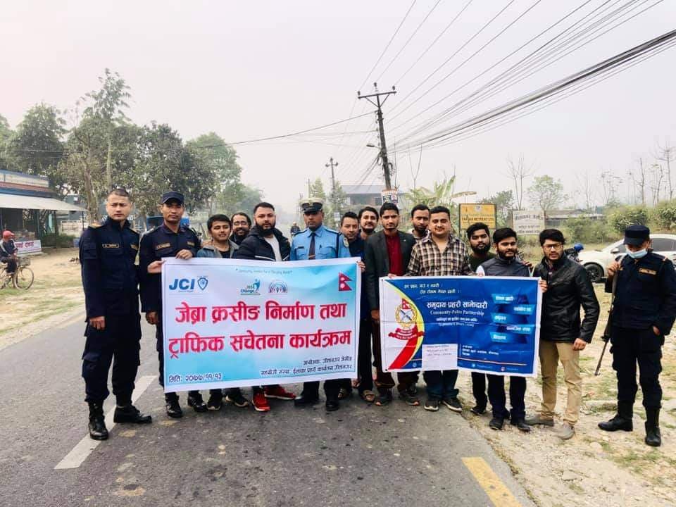 गीतानगर जेसीजको आयोजनामा, ईलाका प्रहरी कार्यालय गीतानगर र चोक बजार हाटबजार व्यवस्थापनको समन्वयमा जेब्राक्रसिङ निर्माण तथा बढ्दो दुर्घटना न्यूनीकरणका लागि ट्राफिक चेतनामूलक कार्यक्रम सम्पन्न भएको छ।