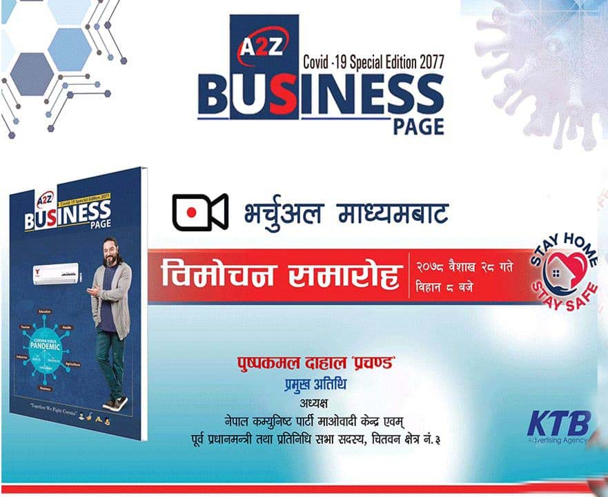 चितवन, २७ वैशाख । केटीबी एड्भरटाईजिङ्ग एजेन्सी एण्ड मिडिया सर्भिस प्रा लि चितवनद्वारा प्रकाशित कोभिड– १९ बिशेष “एटुजेड बिजनेश पेज ̏ को मंगलबार विमोचन हुने भएको छ । चितवन क्षेत्र नं. ३ का सांसद एवं माओवादी केन्द्रका अध्यक्ष पुष्पकमल दाहालले पुस्तकको विमोचन गर्नुहुने छ ।