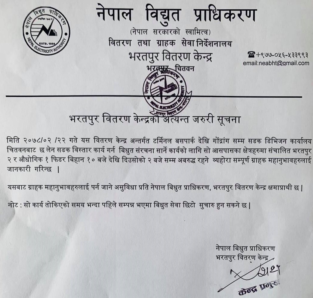 प्राधिकरण भरतपुर वितरण केन्द्रका अनुसार भरतपुर बस टर्मिनलदेखि गोन्द्राङसम्म सडक विस्तारको क्रममा विद्युत पोलहरु सार्ने काम भएकाले विहान १० बजेदेखि दिउँसो २ बजेसम्म विद्युत अवरुद्ध हुने छ ।