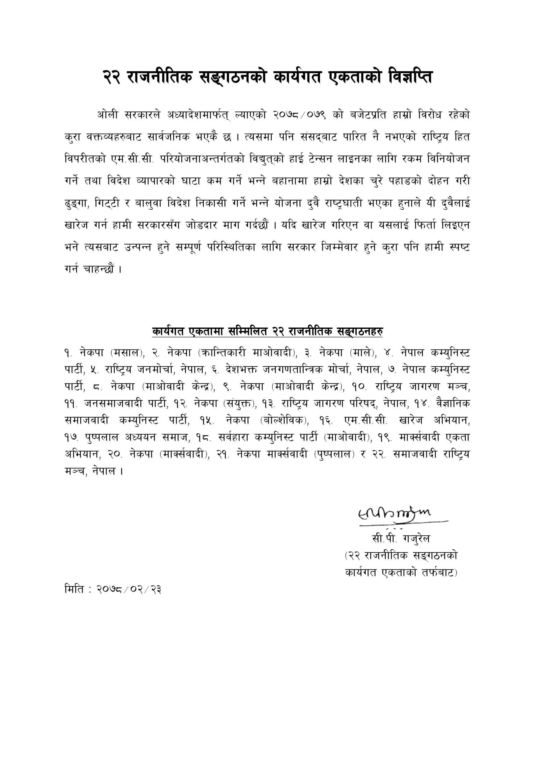 समुहका तर्फबाट नेता सीपी गजुरेलले आइतबार विज्ञप्ति जारी गर्दै २२ दलले यस्तो माग गरेका हुन् । साथै २२ दलले यी दुवै विषय खारेज नगरे उत्पन्न हुने परिस्थितिका लागि सरकार स्वयं जिम्मेवार हुने चेतावनी दिएका छन् । उनीहरुले यसअघि नै अध्यादेशमार्फत ल्याएको बजेटको पनि विरोध गरिसकेका छन् ।