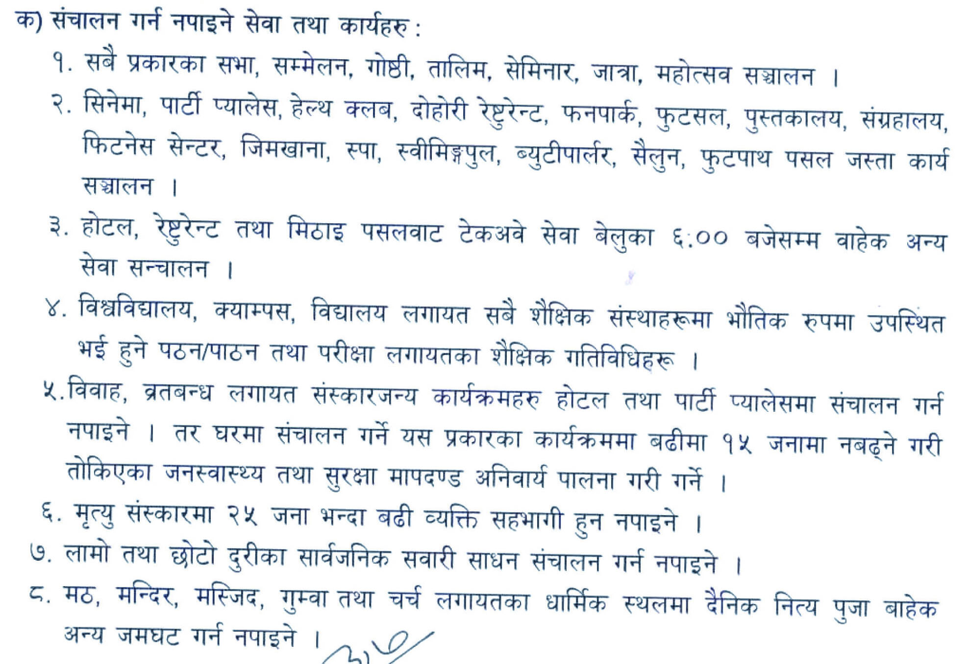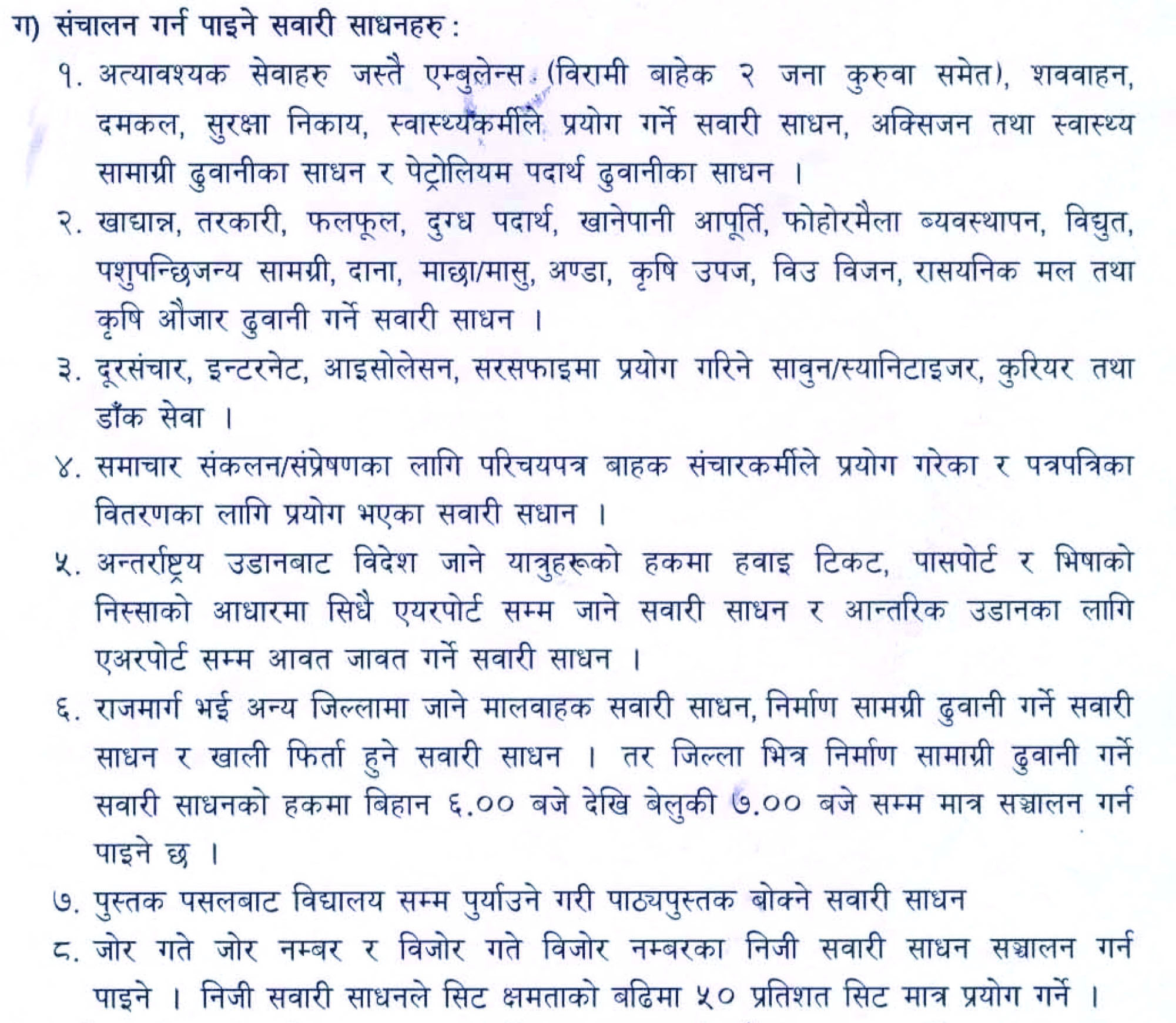 यसैगरी इलेक्ट्रिकल तथा इलेक्ट्रोनिक्स पसल, भाँडा पसल, कपडा पसल, फेन्सी पसल, कम्प्युटर पसल, कस्मेटिक तथा गिरफ्ट पसल, सुनचाँदी पसल, फर्निचर था फर्निसिङ, अटोमोबाईल, मोटरपार्टस्, जुत्ता/चप्पल पसल, टेलरिङ, प्रेस तथा फोटोकपी पसलहरु आईतबार, मंगलबार र बिहीबार दिउँसो १२ बजेदेखि अपरान्ह ४ बजेसम्म सञ्चालन गर्न पाईने छ ।