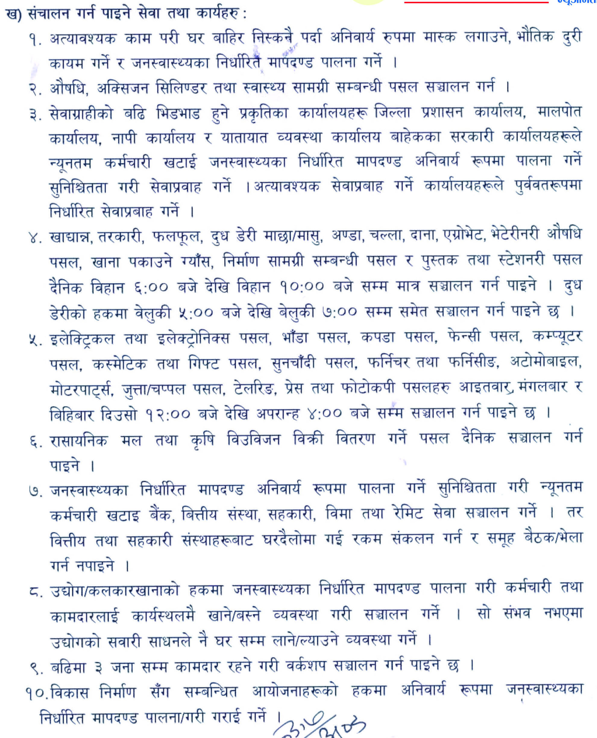 यस्तै खाद्यान्न, तरकारी, फलफूल, दूध डेरी, माछा/मासु, अण्डा, चल्ला, दाना, एग्रोभेट, भेटेरीनरी औषधि पसल, खाना पकाउने ग्याँस, निर्माण सामग्री सम्बन्धी पसल र पुस्तक तथा स्टेशनरीपसल दैनिक बिहान ६ बजेदेखि १० बजेसम्म मात्रै सञ्चालन पाईने भएको छ । दूध डेरीको हकमा बेलुकी ५ बजेदेखि ७ बजेसम्म मात्रै सञ्चालन गर्न पाईने छ ।