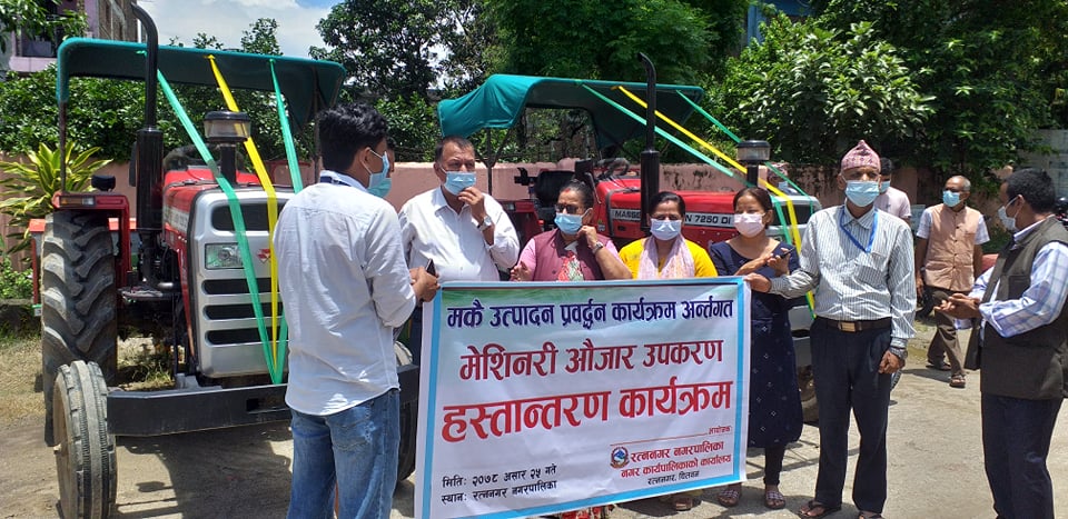 रत्ननगर, २५ आसर । रत्ननगर नगरपालिकाले ५० प्रतिशत अनुदानमा किसानहरुलाई आधुनिक उपकरण वितरण गरेको छ । कृषि उत्पादन बढाउन र लागत मुल्य कम गर्न सो नगरपालिकाले सहकारी तथा कृषि समुह मार्फत किसानहरुलाई ट्याक्टर लगायत अन्य आधुनिक कृषि उपकरण वितरण गरेको हो । मकै उत्पादन प्रर्बद्धन कार्यक्रम अन्तर्गत रत्ननगर १६ पिठुवाको भद्रकाली दुग्ध उत्पादक सहकारी संस्था र रत्ननगर १२ को सुसब एकीकृत कृषि र्फमलाई ट्याक्टर सहित कल्टीभेटर,रोडाभेटर,हाइरो,बीउ राख्ने र मल छर्ने मेसिन,थ्रेसर,टेलर र च्यापकटर मेसिन गरिएको छ । ट्याक्टर सहित अन्य उपकरणलाई ३० लाखमा खरिद गरिएको र किसानले प्रयोग गर्ने गरी ५० प्रतिशत अनुदान अतार्थ १५ लाख रुपैयामा सेट उपलब्ध गराइएको कृषि विकास शाखा प्रमुख प्रविण लामाले जानकारी दिनुभयो ।
