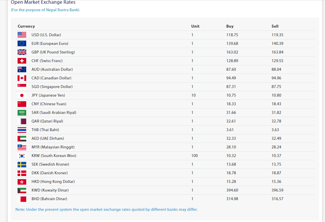यूके पाउन्ड स्टलिङ एकको खरिददर १६३ रुपैयाँ ०२ पैसा र विक्रीदर १६३ रुपैयाँ ८४ पैसा रहेको छ भने स्वीस फ्रेङ्क आज एकको खरिददर १२८ रुपैयाँ ८९ पैसा र विक्रीदर १२९ रुपैयाँ ५५ पैसा रहेको छ ।