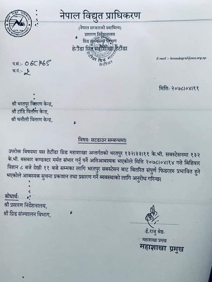 नेपाल विद्युत प्राधिकरण हेटौंडा ग्रिड महाशाखाका अनुसार बिहान ८ बजेदेखि ११ बजेसम्मका लागि भरतपुर सबस्टेशनबाट वितरित सम्पूर्ण फिडरहरु प्रभावित हुने जनाईएको छ ।