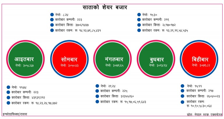 साताभर कूल २२५ कम्पनीको रु ६७ अर्ब ७४ करोड छ लाख ३९ हजार १४५ बराबरको कारोबार भयो । नेपाल स्टक एक्सचेञ्जका अनुसार साताभर कूल १६ करोड ७५ लाख ६६ हजार ११४ कित्ता शेयर कारोबार भयो । सबै दृष्टिकोणबाट हेर्दा साताभर शेयर बजारले नयाँ कीर्तिमान कायम गरेको छ । लगातार उकालो लागेको नेप्सेमा ऐतिहासिक बिन्दु कायम गरेर तीन हजार १०० को बिन्दुमाथि पुगेको थियो । साताको अन्तिम दिन भने नेप्सेमा करेक्सन देखियो । बैंक तथा वित्तीय संस्थाले ब्याजदर घटाएको तथा अधिक तरलता रहेका कारणले पनि शेयर बजारमा सकारात्मक प्रभाव देखा परेको हो ।