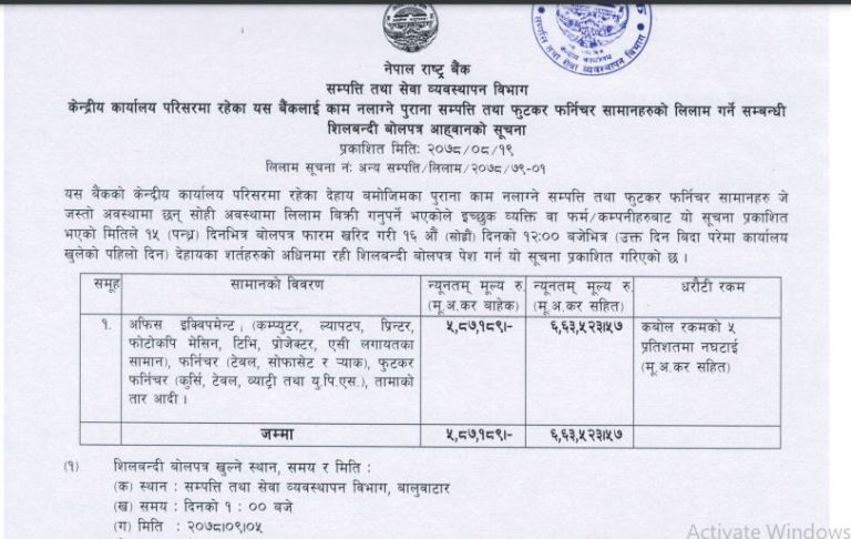 काठमाडौं, १९ मंसिर । नेपाल राष्ट्र बैंकले काम नलाग्ने सम्पत्ति तथा फर्निचर सामानहरु लिलाम गर्ने भएको छ । बैंकलाई काम नलाग्ने सम्पत्ति लिलाम बिक्रिका लागि आइतबार शिलबन्दी बोलपत्र आह्वान गरिएको हो ।