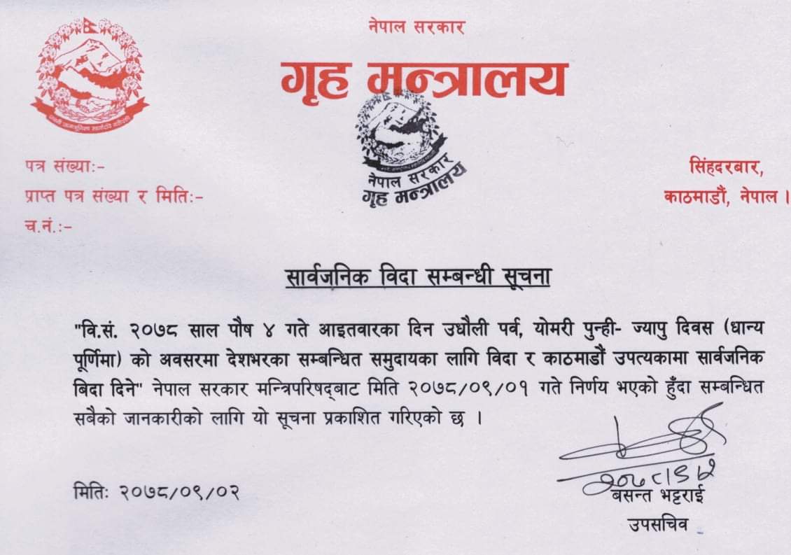 गृहमन्त्रालयका उपसचिव बसन्त भट्टराईले सूचना जारी गरी बिदा बारे जानकारी गराएका छन् । पुस १ गते बसेको मन्त्रिपरिषद् बैठकले आइतबार सार्वजनिक बिदा दिने निर्णय गरेको हो ।
