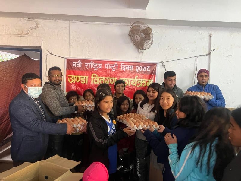 चितवन, १७ पुसः किसान दाना उद्योग प्रालि र दाउन्ने एग्रो फार्म प्रालिले पोल्ट्री दिवसका अबसरमा काठमाडौंमा आज अण्डा बितरण गरेको छ । ती संस्थाले नक्साल र शिफलमा रहेको बालमन्दीरका बालबालिकाहरुलाई अण्डा बितरण गरेको हो ।