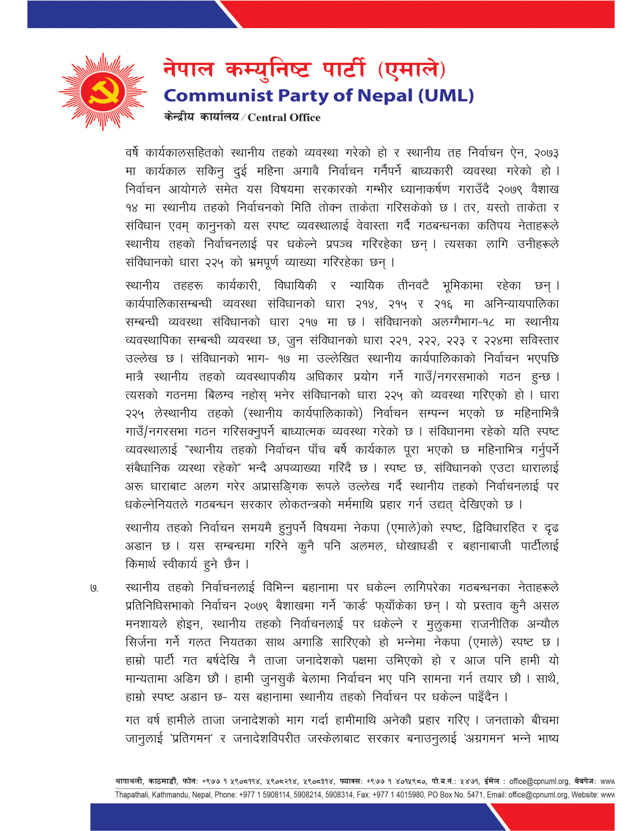 वक्तव्यमा स्थानीय तहको निर्वाचन सम्बन्धमा कुनै पनि अलमल, धोखा र बहानाबाजी स्वीकार्य नहुने जनाईएको छ । यद्यपि जुनसुकै बेला निर्वाचन भए पनि सामना गर्न तयार रहेको बताउँदै ओलीले भन्नुभएको छ “हाम्रो स्पष्ट अडान छ– यस बहानामा स्थानीय तहको निर्वाचन पर धकेल्न पाइँदैन ।”