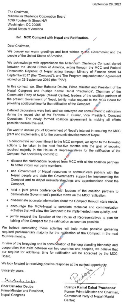 दुबै नेताले सेप्टेम्बर २९ अर्थात् असोज १३ गते एमसीसी बोर्डलाई पत्र पठाएका थिए । एमसीसी बोर्ड अध्यक्षलाई सम्बोधन गरेर पठाइएको संयुक्त पत्रमा एमसीसी संसदबाट अनुमोदन गर्ने दुबै नेताले प्रतिवद्धता जनाउँदै चार÷पाँच महिनाको समय मागेका थिए । “हामी प्रधानमन्त्री शेरबहादुर देउवा र सत्ता गठबन्धनका नेता नेकपा माओवादी केन्द्रका अध्यक्ष पुष्पकमल दाहाल ‘प्रचण्ड’ संयुक्त रुपमा एमसीसी सम्झौता संसदबाट पारित गर्न थप समय उपलब्ध गराउन एमसीसी बोर्डलाई आग्रह गर्दछौं,” दुबै नेताद्वारा हस्ताक्षरित संयुक्त पत्रमा भनिएको छ ।
