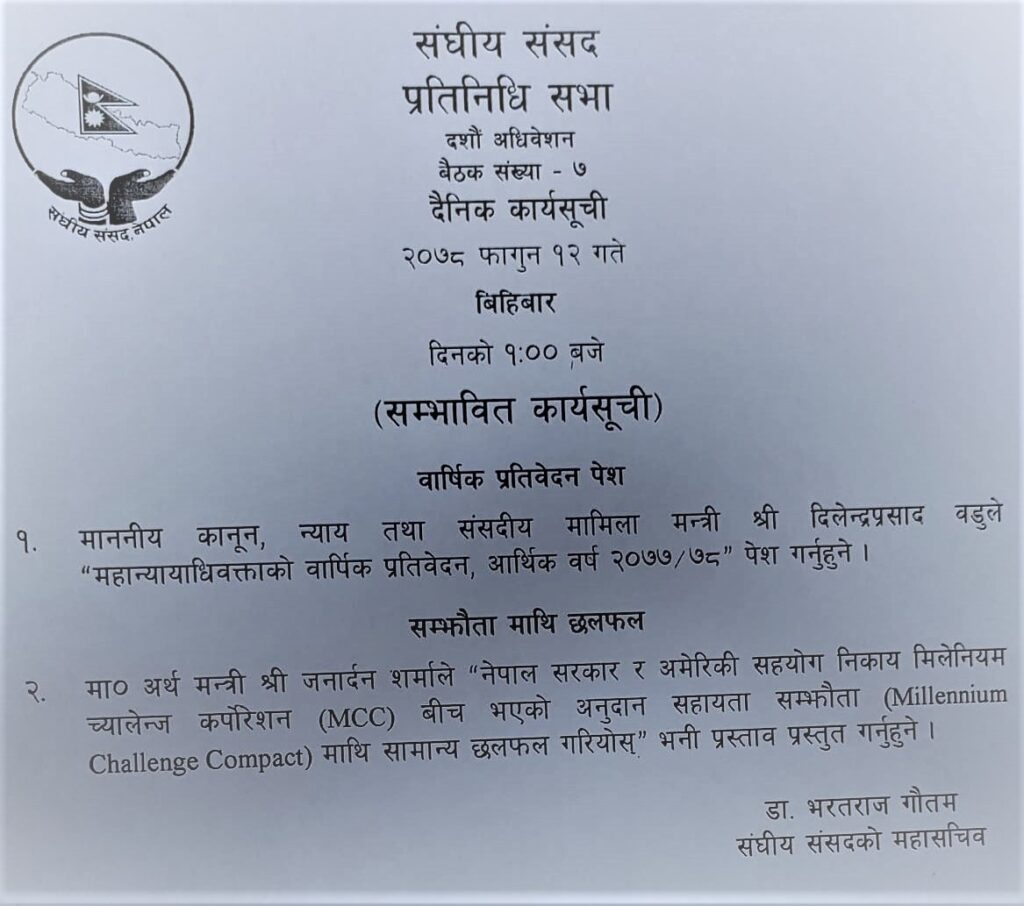संसदमा भोलि एमसीसीमा छलफल, यस्तो छ, संसदको कार्यसूचि