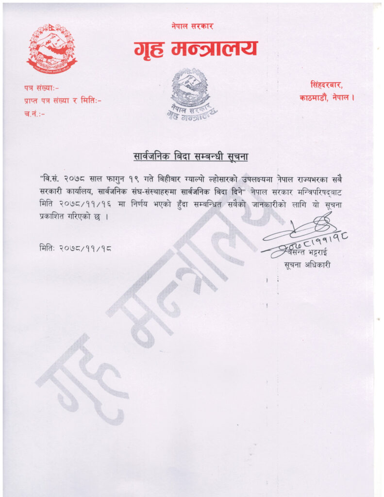 काठमाडौँ, १८ फागुन। बिहीबार सार्वजनिक बिदा हुने भएको छ । शेर्पा समूदायको ग्याल्पो ल्होसारको अवसरमा बिदा दिने निर्णय भएको हो । गृह मन्त्रालयले पर्वको अवसरमा बिहीबार बिदा दिने निर्णय भएको जानकारी दिएको छ । सरकारले सबैखाले ल्होसारमा बिदा दिँदै आएको छ ।