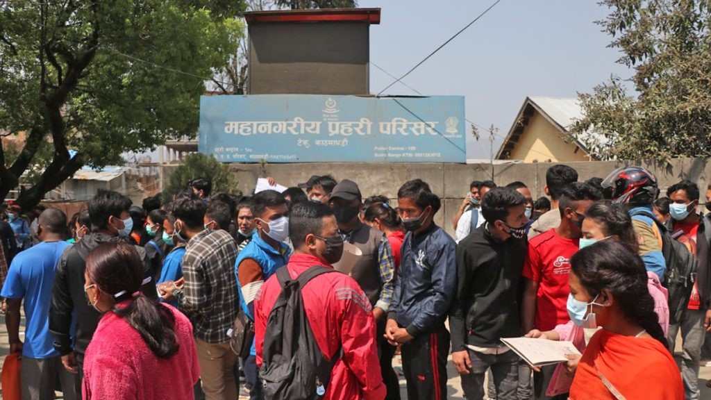 भर्ना खुलेसँगै उपत्यकासहित देशभरका जिल्ला प्रहरी कार्यालयहरुमा डेढ महिने रोजगारीका लागि आवेदन दिन हजारौं युवा चर्को घाममा लामबद्ध देखिन्छन् । थोरै अवधिका लागि आवेदन मागिएपनि यस्तो आकर्षण देखिनु मुलुकमा बेरोजगारीको डरलाग्दो अवस्थामा प्रतिबिम्बित भएको छ ।