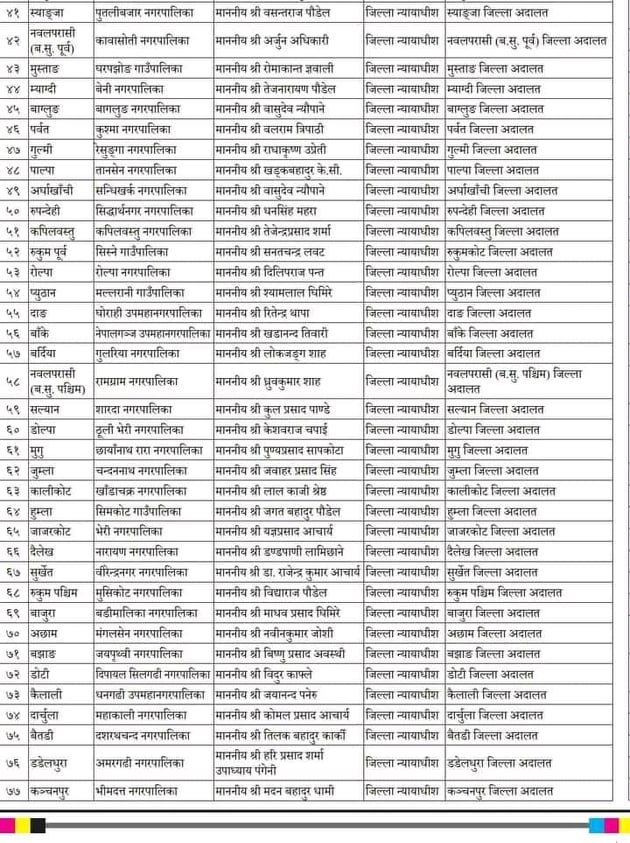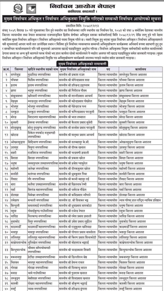 यसैगरी ईच्छाकामना गाउँपालिकाको निर्वाचन अधिकृतमा ईश्वर आचार्यलाई तोकिएको छ । उहाँ चितवन जिल्ला अदालतका स्रेस्तेदार हुनुहुन्छ । कालिका नगरपालिकामा जिल्ला सरकारी वकिल कार्यालयका जिल्ला न्यायाधिवक्ता महेशप्रसाद खत्रीलाई तोकिएको छ ।