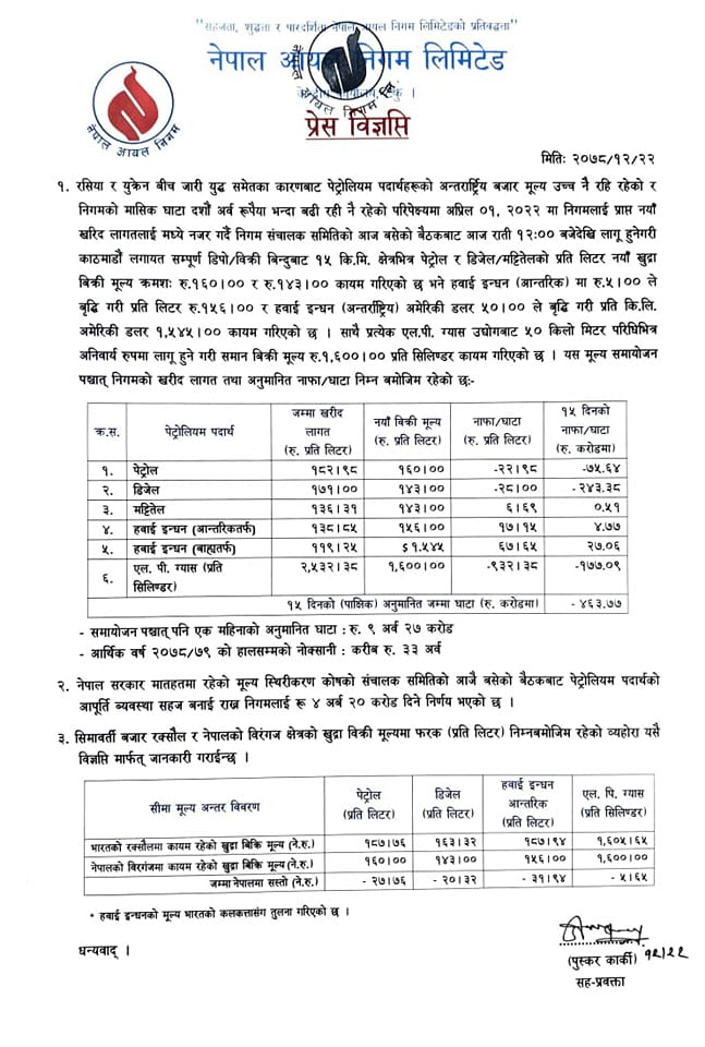 भारतबाट मूल्य बढेर आएकाले नेपालमा पनि भाउ बढाइएको निगमका सहप्रवक्ता पुष्कर कार्कीले जनाएका छन्। यसअघि निगमले २ चैतमा पेट्रोलियम पदार्थको मूल्य बढाएको थियो।