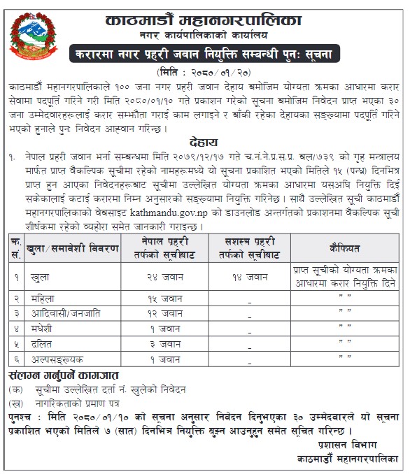 खुलातर्फ नेपाल प्रहरीका तर्फबाट २४ जवान र सशस्त्र प्रहरी तर्फबाट १४ जवान राखिनेछ। प्राप्त सूचीको योग्यता क्रमका आधारमा करार नियुक्ति दिइने महानगरले जनाएको छ।