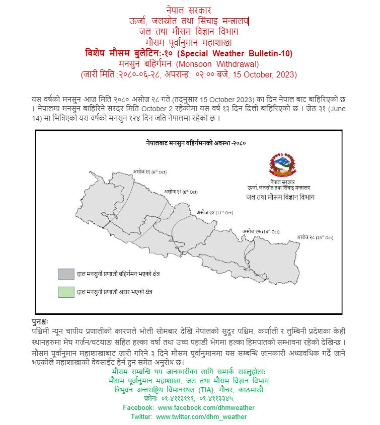 काठमाडौँ, २८ असोज । यस वर्षको मनसुन नेपालबाट पूर्णरूपमा बाहिरिएको छ । असोज १९ गते पश्चिम नेपालबाट बाहिरिन थालेको मनसुन आज आइतवारदेखि देशभरबाट बाहिरिएको मौसम पूर्वानुमान माहाशाखाले विशेष बुलेटिनमार्फत जानकारी गराएको छ ।
