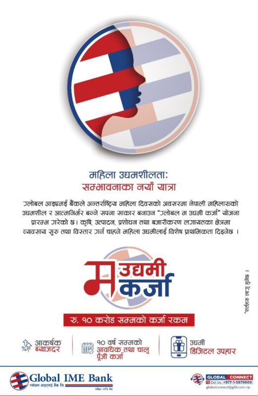 काठमाण्डौं, २३ फागुन । ग्लोबल आइएमई बैंक लिमिटेडले साना तथा मझौला उद्यमी लक्षित ‘ग्लोबल म उद्यमी कर्जा’ सार्वजनीक गरेको छ । महिला उद्यमीहरुलाई वित्तीय सहजीकरण गर्ने उद्देश्यसहित रोजगारीको विकास, सामाजिक विकास र स्थानीय समुदायहरुमा आर्थिक सशक्तिकरणमा सहयोग पुग्ने गरी बैंकले उक्त कर्जा ल्याएको हो ।