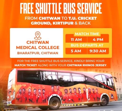 चितवन, २ मङ्सिर । क्रिकेट क्लब चितवन राइनोजले आफ्ना समर्थकलाई काठमाडौँ लैजाने र ल्याउने बसको व्यवस्था गरेको छ । नेपाल प्रिमियम लिग (एनपीएल)को फ्रेन्चाइज टिम चितवन राइनोजले आफ्नो खेल हुने दिनमा चितवनका समर्थकलाई चितवनदेखि काठमाडौँसम्म निःशुल्क बस सेवाको व्यवस्था गरेको हो ।