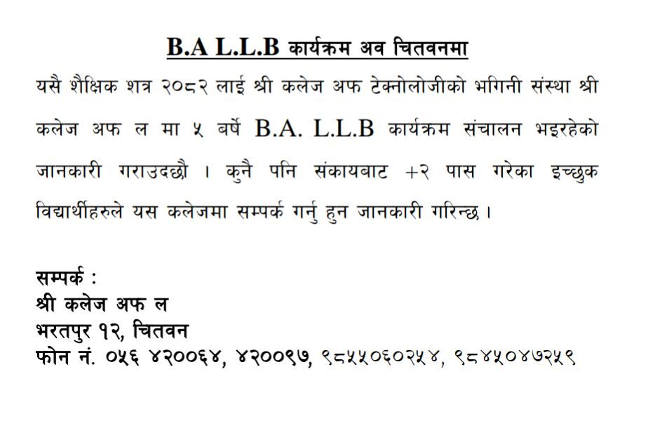 चितवन, १६ पुस । चितवनमा श्री कलेज अफ ल सञ्चालनमा आएको छ । भरतपुर–१२ गोन्द्राङ्गमा रहेको श्री कलेज अफ टेक्निोलोजीको भगिनी संस्थाको रुपमा श्री कलेज अफ ल सञ्चालनमा आएको हो ।