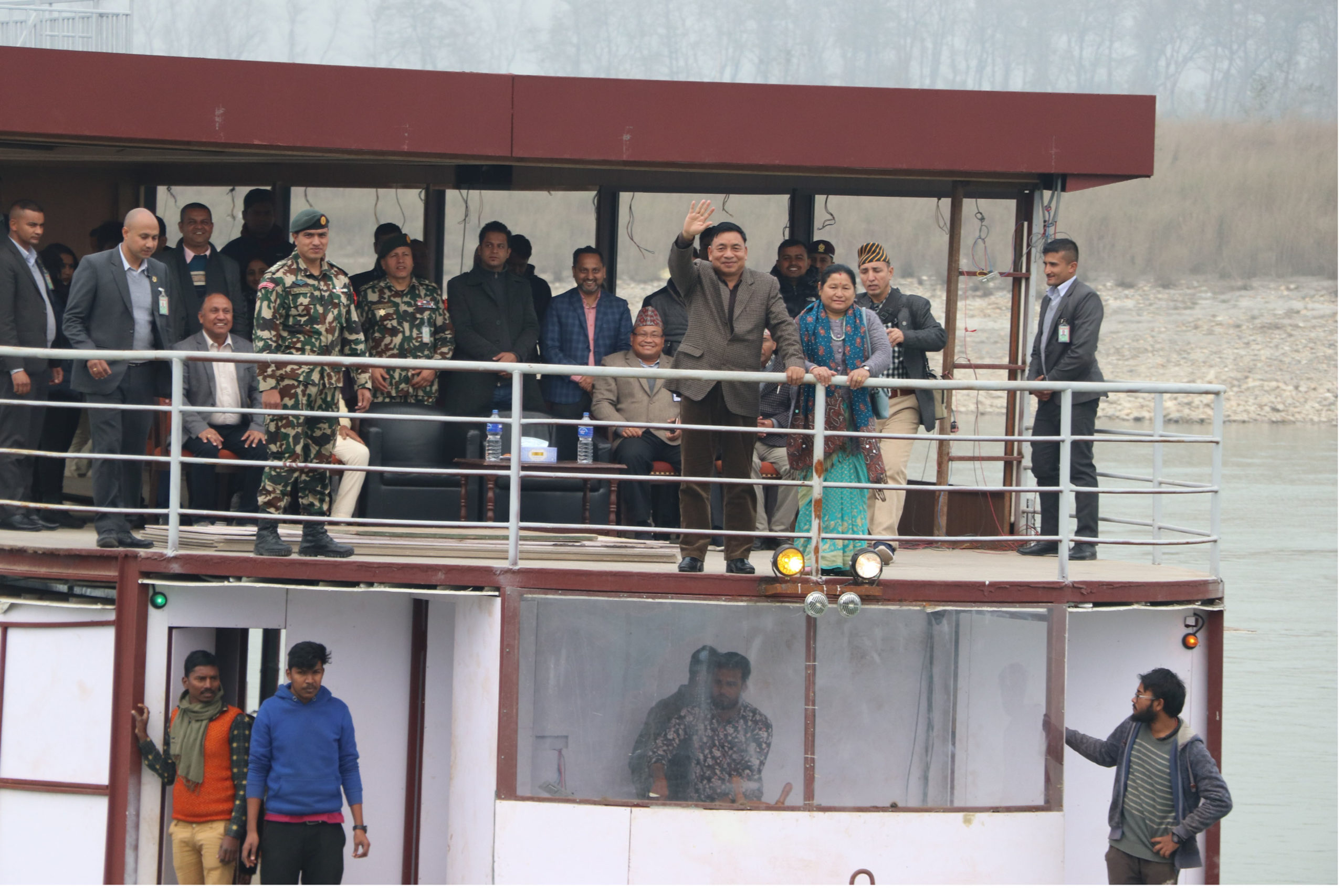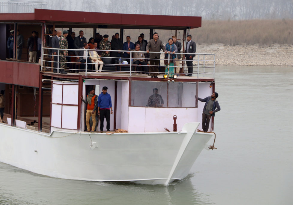 चितवन । नारायणी नदीमा सञ्चालनको तयारीमा रहेको क्रुज (सानो पानीजहाज)मा आज उपराष्ट्रपति नन्दकिशोर पुनले परीक्षण शयर गर्नुभएको छ । क्रुजको निरीक्षणपछि नारायणी नदीमा केही समय उपराष्ट्रपति पुनसहितको टोलीलाई क्रुजमा यात्रा गराइएको थियो ।