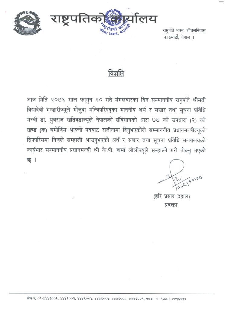 राष्ट्रपति भण्डारीले प्रधानमन्त्रीको सिफारिसमा डा. खतिवडाले सम्हाली आउनुभएको अर्थ र सञ्चार तथा सूचना प्रविधि मन्त्रालयको कार्यभार प्रधानमन्त्री केपी शर्मा ओलीले सम्हाल्ने गरी तोक्नुभएको राष्ट्रपतिको कार्यालयले जनाएको छ ।