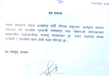 काठमाडौं । सरकारले विप्लव नेतृत्वको नेकपासँग वार्ता गर्न गृहमन्त्री रामबहादुर थापा बादलको नेतृत्वमा वार्ता टोली गठन गरेको छ । प्रधानमन्त्रीका विदेश मामिला सल्लाहकार डा राजन भट्टराई त्यसको सदस्य हुनुहुन्छ । सरकारका प्रवक्ता पार्वत गुरुङले सञ्चारमन्त्रालयमा पत्रकार सम्मेलन गरी वार्ता टोली...