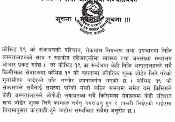 काठमाडौँ, २२ मंसिर । स्वास्थ्य तथा जनसंख्या मन्त्रालयले अस्पतालहरुलाई कोरोना (कोभिड १९) को बहानामा बिरामीसँग अतिरिक्त शुल्क नलिन निर्देशन दिएको छ । मन्त्रालयका सहप्रवक्ता डा समीरकुमार अधिकारीले केही निजी अस्पतालले कोभिड–१९ को बहानामा बिरामीबाट अतिरिक्त शुल्क लिने गरेको पाइएकाले...