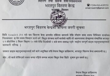 चितवन, २२ जेठ । जिल्लाका केही स्थानमा आज शनिबार विद्युत अवरुद्ध हुने भएको छ । विद्युत पोल विस्तार कार्य गर्नुपर्ने भएकोले विरुद्ध अवरुद्ध हुने भएको हो । प्राधिकरण भरतपुर वितरण केन्द्रका अनुसार भरतपुर बस टर्मिनलदेखि गोन्द्राङसम्म सडक विस्तारको क्रममा विद्युत...