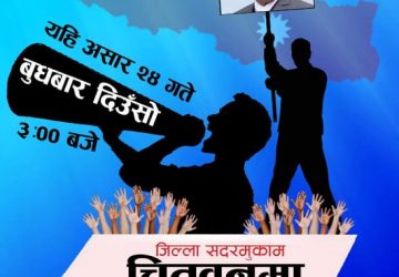 चितवन । स्थिर सरकारको पक्षमा बुधबार भरतपुरको चौबीसकोठीमा वृहत प्रदर्शन हुने भएको छ । दिउँसो ३ बजे स्थिर सरकारको पक्षमा देशभक्त युवा, विद्यार्थी तथा नागरिक अगुवाहरुले प्रदर्शन गर्न लागेका हुन् । जिल्लाका विभिन्न स्थानबाट राष्ट्रिय झण्डा, प्लेकार्ड र ब्यानर सहित...
