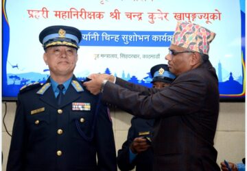काठमाडौँ, १९ भदौक । नवनियुक्त प्रहरी महानिरीक्षक चन्द्रकुवेर खापुङले आज दर्ज्यानी चिन्ह् लगाउनुभएको छ । सिंहदरबारस्थित गृह मन्त्रालयमा आयोजित समारोहबीच गृहसचिव गोकर्णमणि दुवाडीले उहाँलाई दर्ज्यानी चिन्ह लगाइदिनुभएको हो । सो अवसरमा गृहसचिव दुवाडीले सरकारले क्षमता, कार्यदक्षता, जेष्ठतालगायत आधारमा प्रहरीको सर्वोच्च...